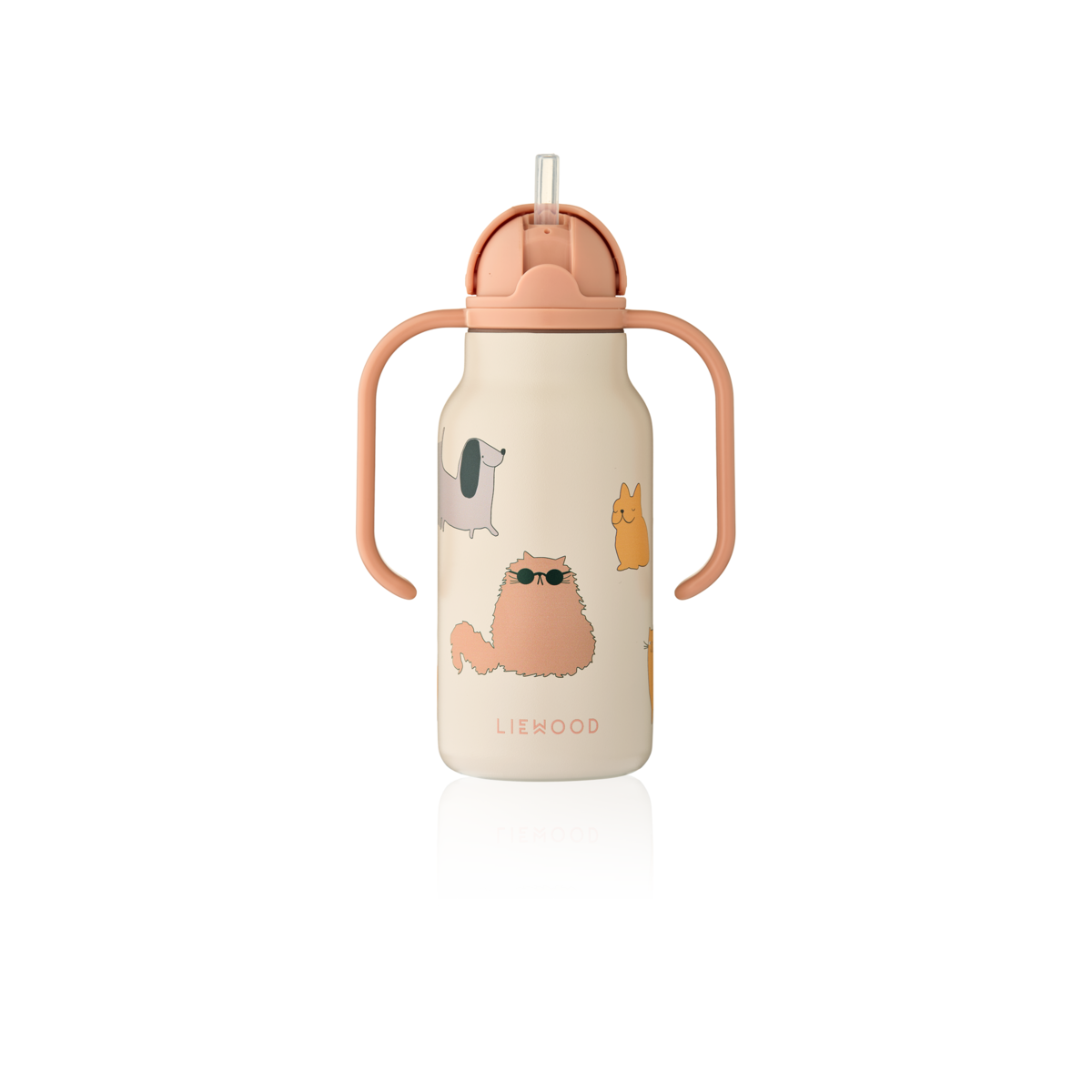 Innovative and toddler-friendly, the KIMMIE water bottle has two easy handles on the lid, a built-in straw and is made of 80% recycled premium stainless steel. It is designed to be easy for little hands to handle when learning to tilt and drink water on their own.