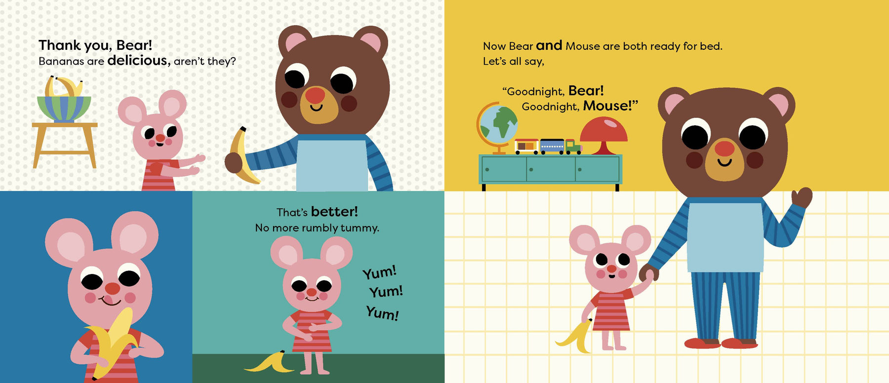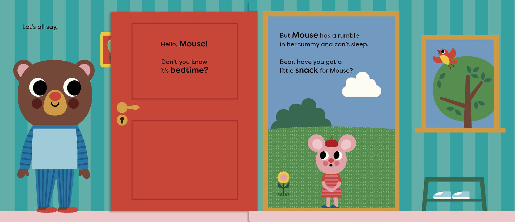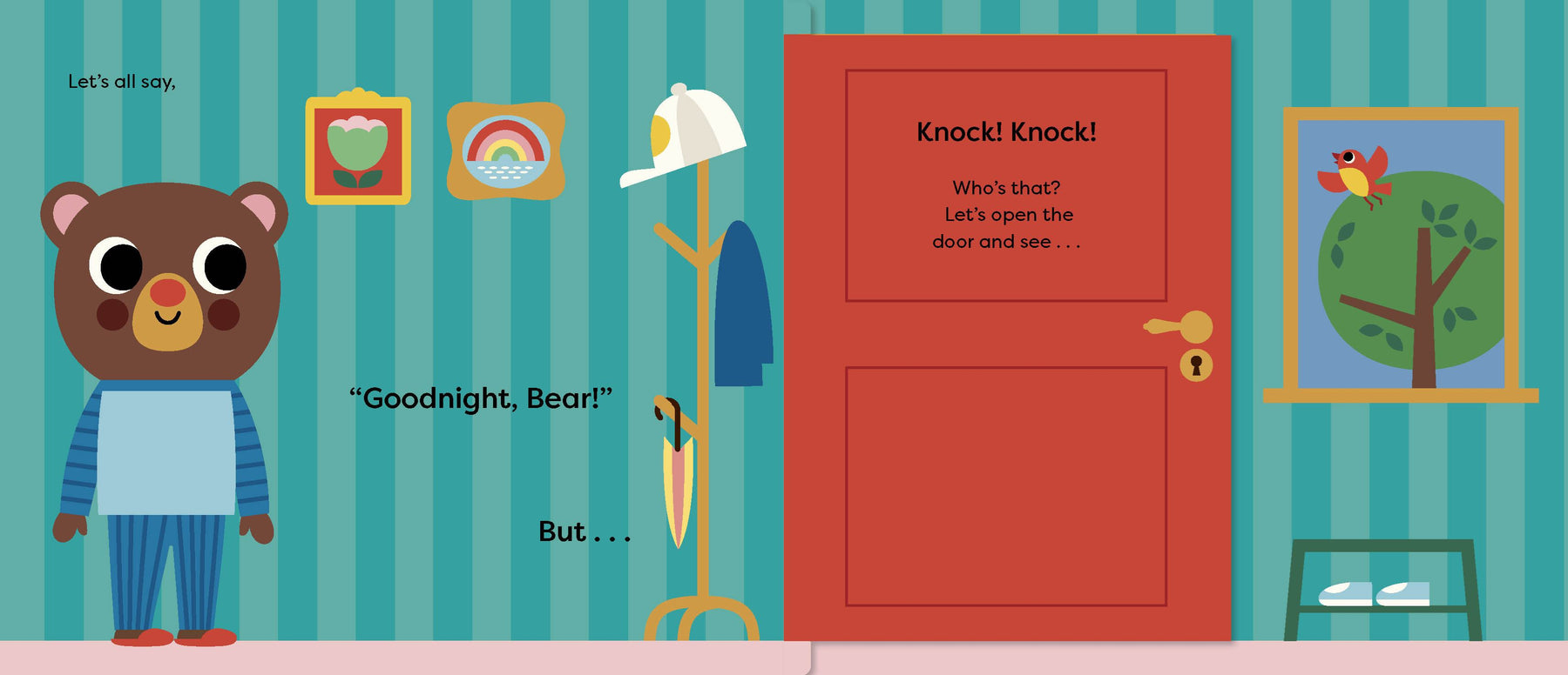 Bear is getting ready for bed. He's had a little snack, brushed his teeth and put on his big bear pyjamas when - Knock! Knock! Someone is at the door. Don't they know it's bedtime? It's Mouse, and she needs a little snack. Then Crocodile arrives. Her toothbrush is broken, and - uh oh - Lion's pyjamas are too small, and now wide-awake Owl is playing her trumpet very loudly. Can Bear help his friends so they all get a good night's sleep?