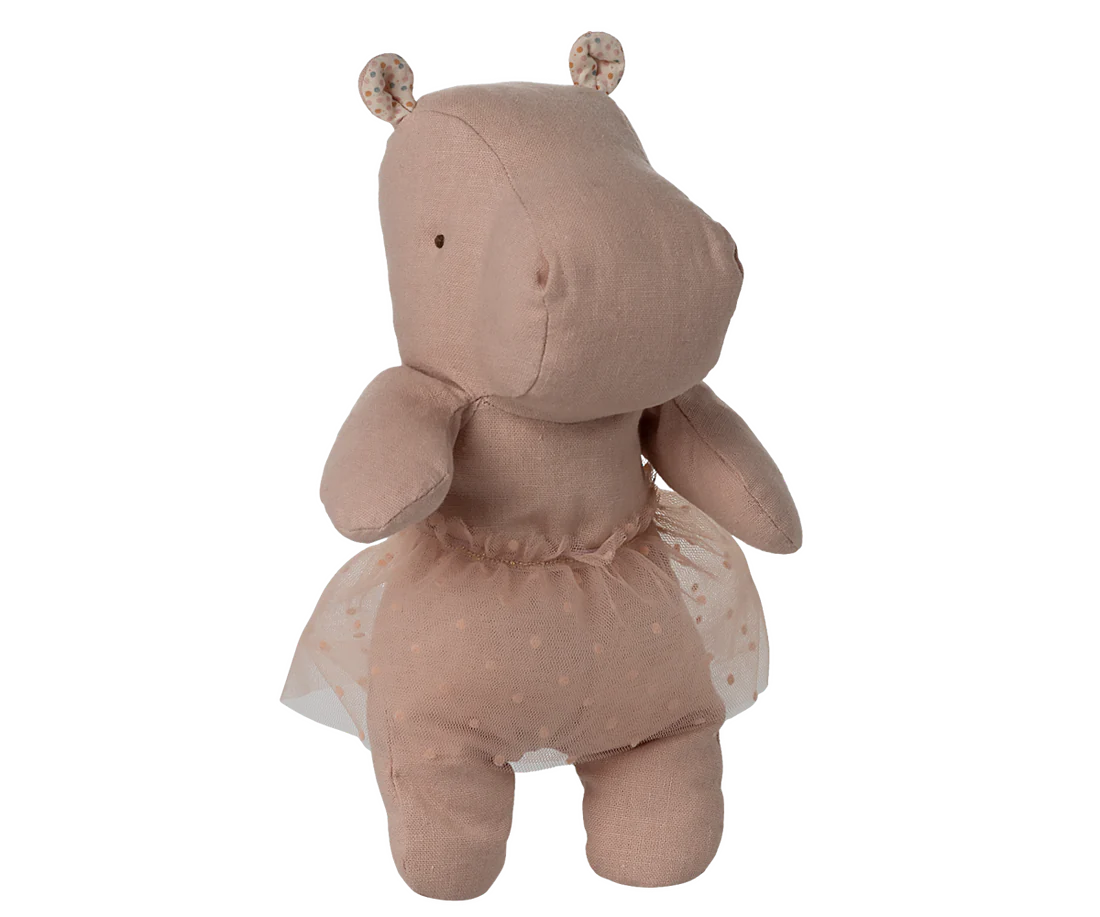 Safari friends are made in the softest fabric and come in great colors. They can sit by themselves as they have beans in their bottom. They are just waiting for you to come and hug them. This small hippo is wearing a beautiful ballerina skirt.