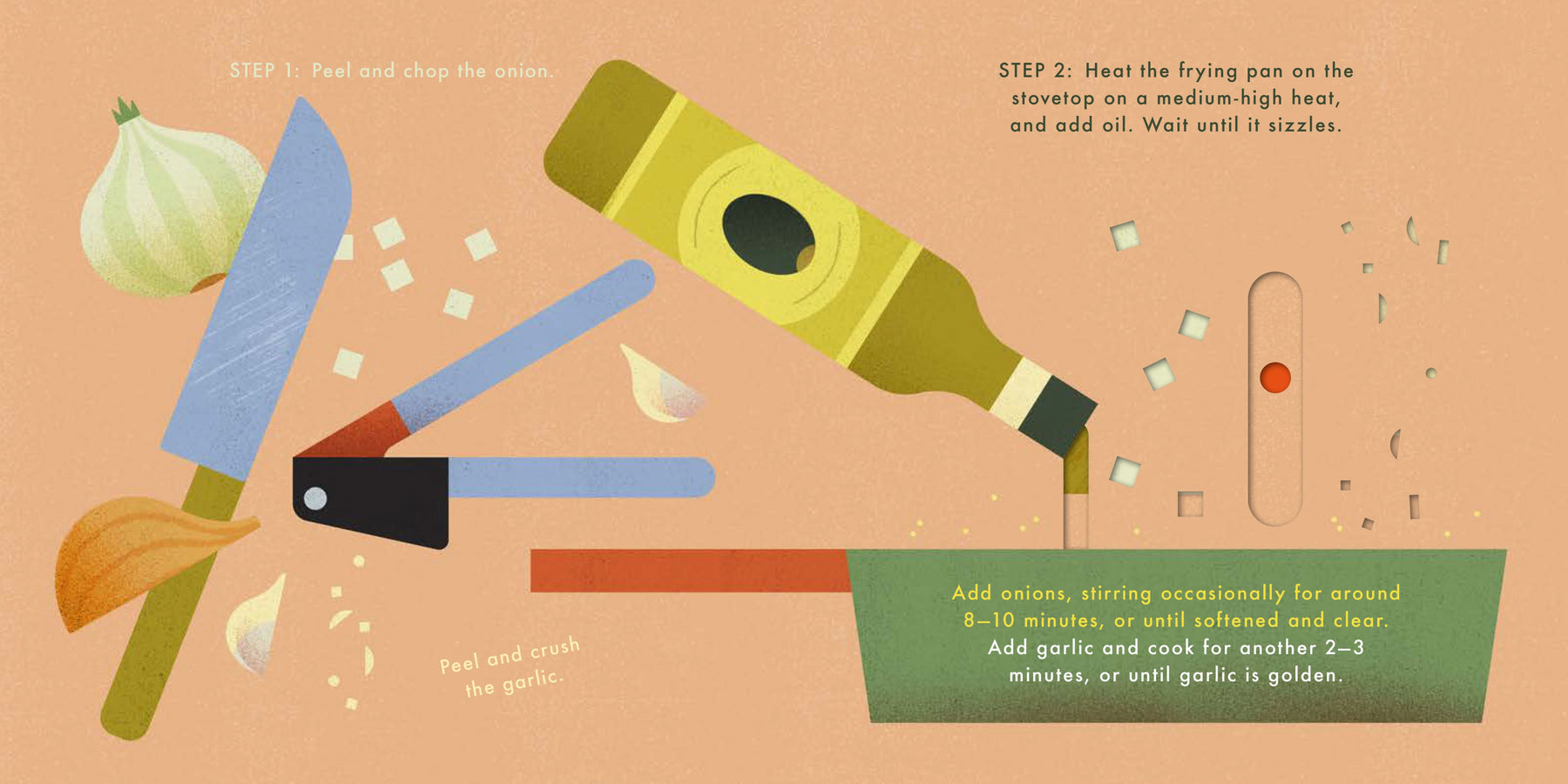 Cook pasta from scratch inside this interactive recipe book – without the chance of spilling anything. Move the tab up and down to add the onions and garlic, lift the flap to open the can of tomatoes, pull the tab to bring the water to a boil, use the punch-out fork to twist some spaghetti onto your fork to taste, and more. One hundred percent adult-free, danger-free, and mess-free – whether you are cooking outside or inside this book, spaghetti has never been so independent!