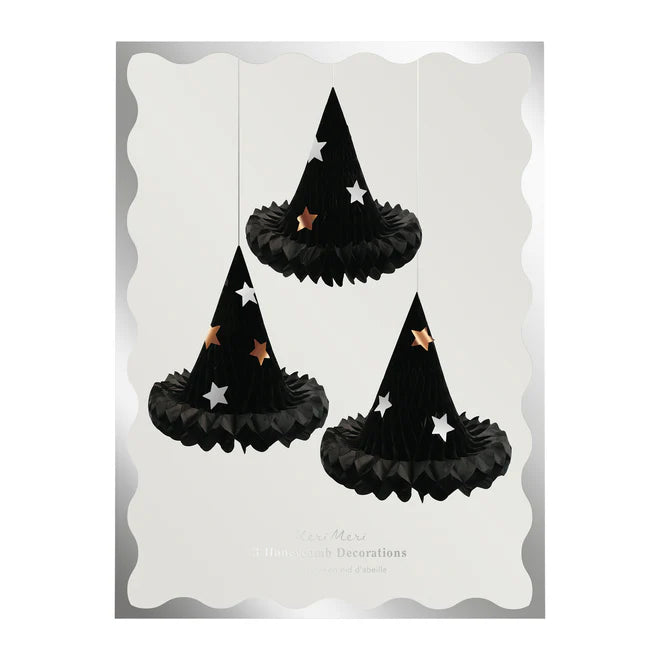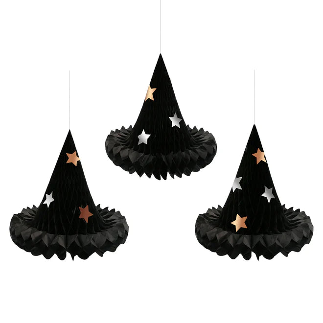 A witch hat is such a fabulous Halloween icon, and makes a terrific hanging decoration too. Let these 3 honeycomb hats gently sway in the garden or porch, or dangle from the ceiling, for a thrilling effect. Pack them away after use, then bring back year after year for lots of Halloween fun.