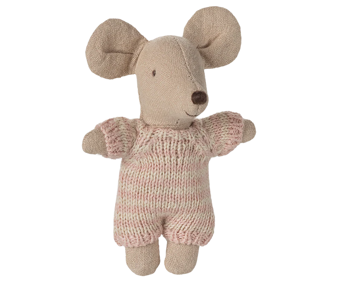 A small baby mouse in a soft and striped knitted suit. It sleeps for hours in its little quilted carry cot.