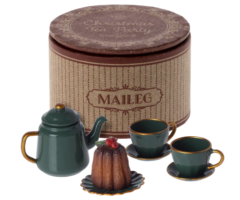Decorate a cozy Christmas tea table with this lovely set. It is perfect in size for the mouse family. In the beautiful giftbox you find a metal tea pot, two cups, a plate and a deliciously decorated cake made in polyresin.