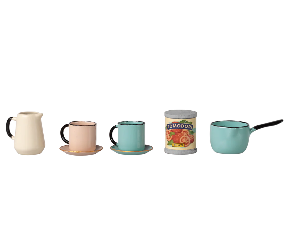 The small kitchen counter comes with 2 cups and 2 plates, a pot and a pitcher and a small can. The small sink is made of metal to look as real as possible. It fits perfectly into the kitchen in the SuitCasa mouse house.