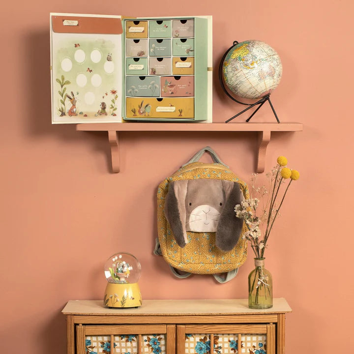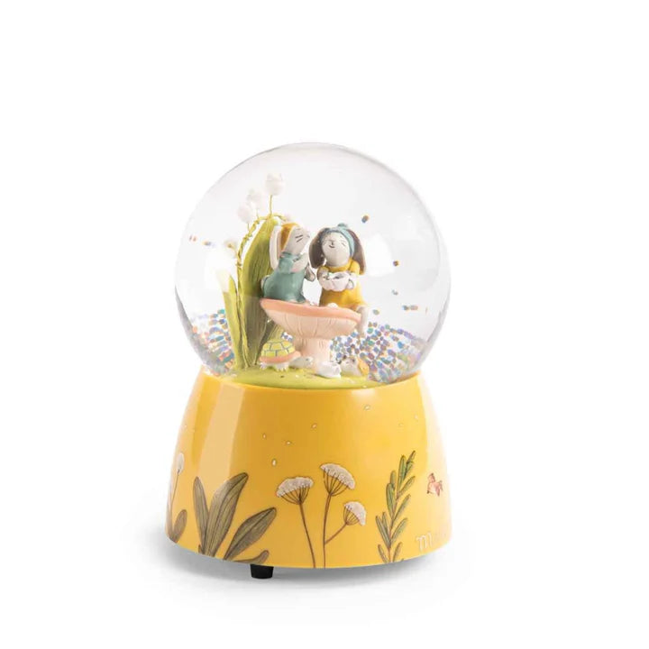 Snow globe featuring 2 little rabbits and their friends from the Trois Petit Lapin Collection. Here they are in the garden, sitting on a mushroom amongst the holographic glitter and sharing a cup of tea! As well as decorating the nursery, its sweet melody will settle baby at bedtime. A truly magical piece to be loved and treasured for years.