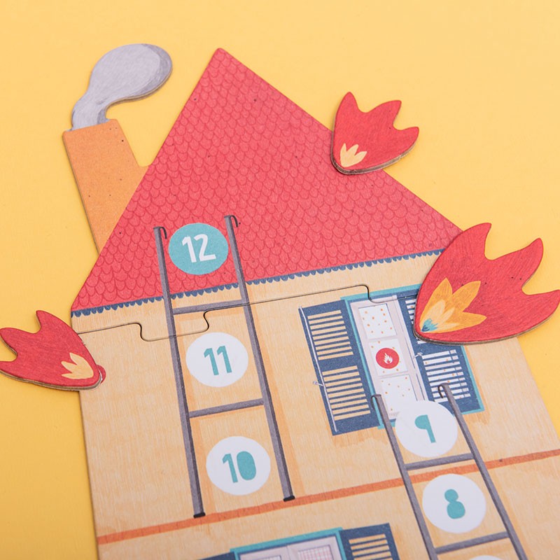 Playing at being firefighter we work on team decision making, counting and waiting our turn. A cooperative board game for children aged 4 and up where we have to help the firemen rescue a kitten from the fire! In pocket format for travelling.