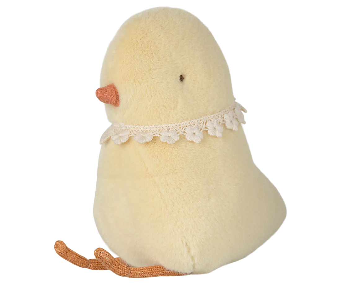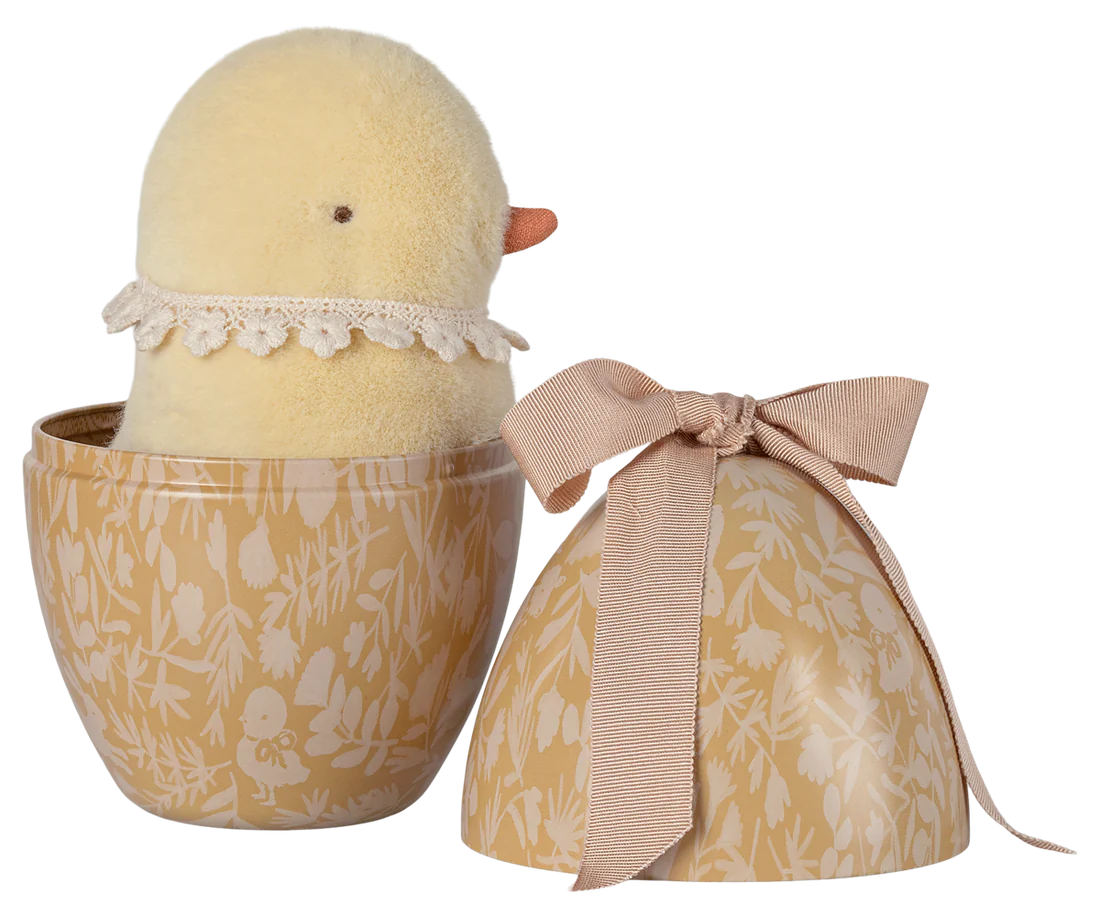 A sweet soft plush chicken with a vintage cotton collar around the neck, packed in a lovely metal egg with a beautiful print and a big soft bow on top - a perfect gift for the small ones.