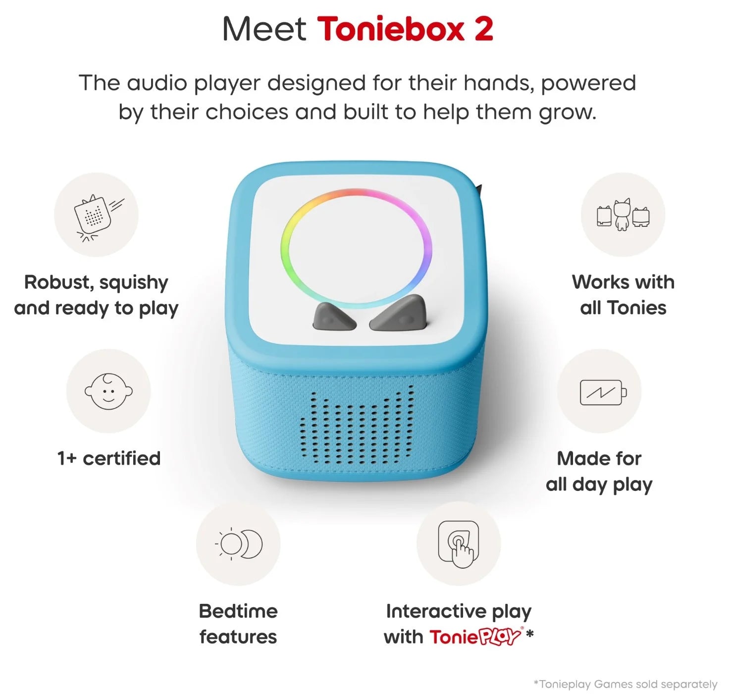 Toniebox 2 is the kid-powered audio player with even more ways to play, designed for ages 1-9+. Kids can dive into favorite stories and songs with an ever-growing crew of Tonie characters, just by popping one on the Toniebox. Or, unlock interactive games, quizzes, and challenges where they take the lead with Tonieplay.