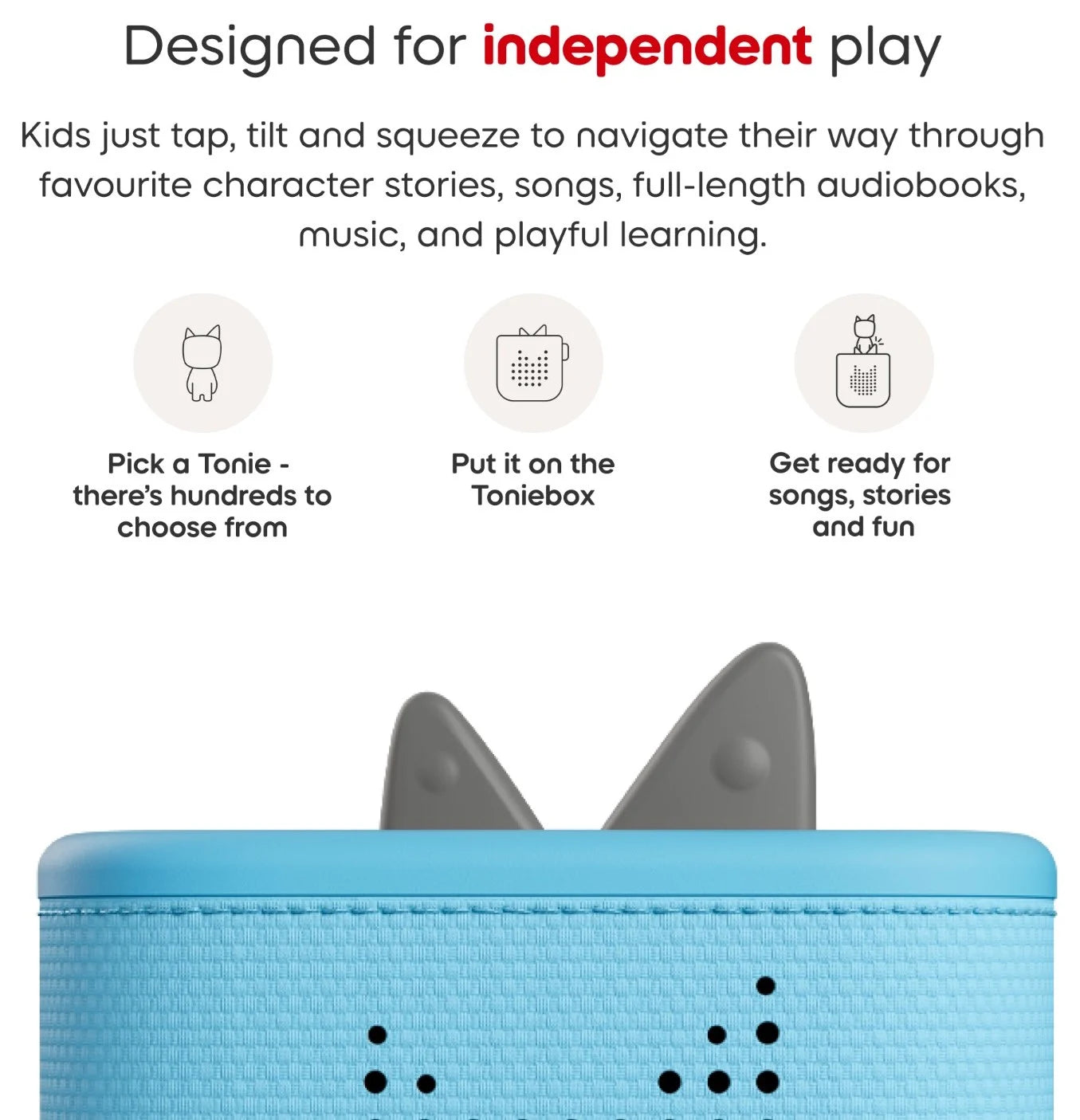 • Tonies - Audiobooks: Add ready-to-play Tonies with preloaded audiobooks or music to grow your library. Each sold separately.